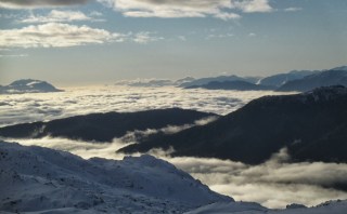 Light falls across the mountains with crisp shadows