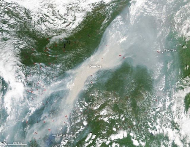 A day photo of smoe and a night photo of wildfires viewed from space show the extent of the problem. In the night iage (each from N.A.S.A.) that little lake inshore from the Sea of Okhoskt is the Zeya Reservoir.