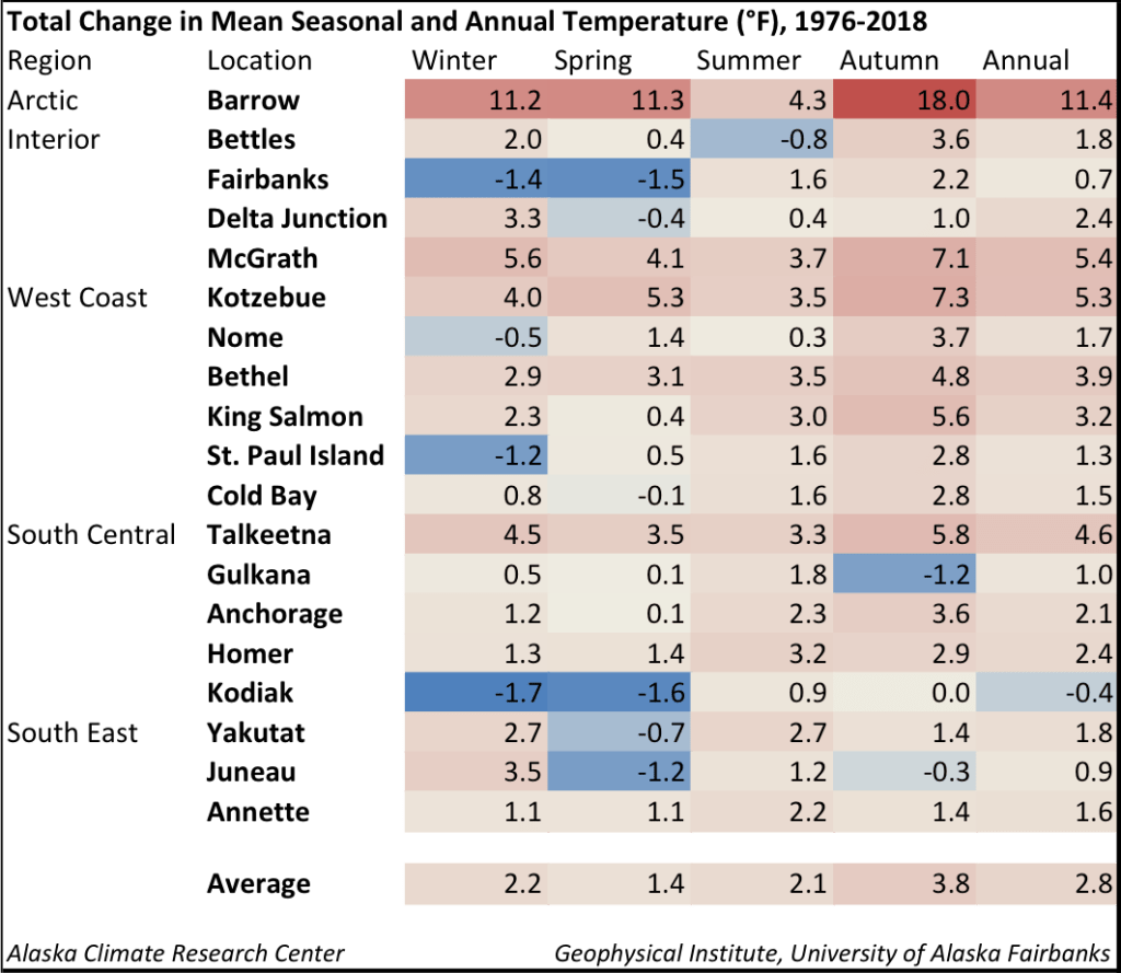 Alaska’s northern towns have warmed up a lot since 1976. The Alaska Climate Research Center publishes a chart comparing temperatures from 1976 to 2018, and the results are consistent with global warming observations and theories. The temperature change for Barrow in autumn, for example, is 18.0 degrees Fahrenheit.