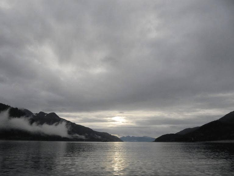 A third of the across the water crossing to Slocum Inlet 17 miles S.E. of Juneau the small rippling waves took on a different tone with darker scuds hanging from nimbus clouds scurrying wet as if they had someplace to be. An odd fog cloud with fingers crawled from Admiralty toward the water. In the distance whitecaps appeared. With just so much daylight remaining there wasn’t really a choice of turning back. The journey was to the south at any rate; one need be going somewhere.