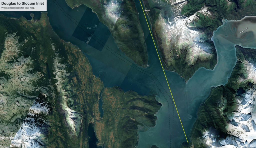 I was in a survival situation with no place to go beside forward. I should have felt some emotion yet I realized that if the boat capsized- and that was even likely, I would drown and die of hypothermia and the boat would end up several miles downwind on the shore of Admiralty Island. The waves were too high and tightly spaced to risk running with them. The bow would have buried itself in a wave trough or pitch-poled most likely, and going against them was an idiot’s choice. Instead I tried to surf them a little angling somewhat forward, speeding in troughs and sometimes surfing along crests while trying to let them pass beneath as I continued toward Slocum Bay on the south side of Taku Inlet.